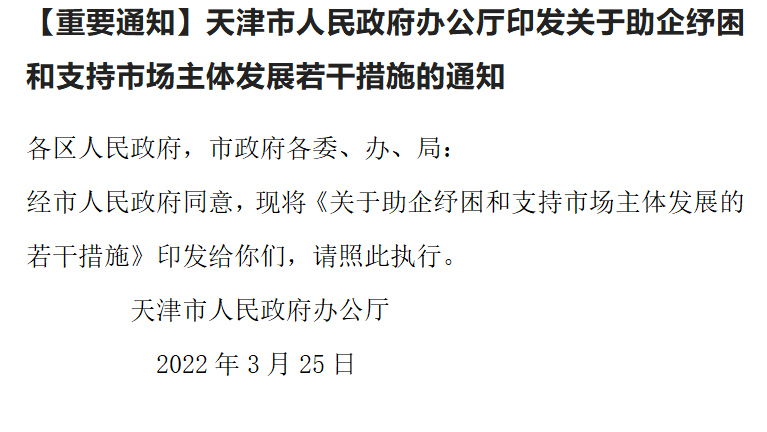 各區(qū)人民政府,市政府各委、辦、局: 經(jīng)市人民政府同意,現(xiàn)將《關(guān)于助企紓困和支持市場主體發(fā)展的若干措施》印發(fā)給你們,請照此執(zhí)行。 天津市人民政府辦公廳 2022年3月25日 附: